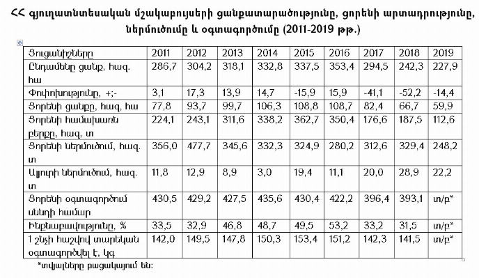 ՀՀ Գյուղատնտեսության նախարարի նախկին տեղակալ Աշոտ Հարությունյանը «Հայաստանի պարենային անվտանգությունը տարածաշրջանային հնարավոր ապաշրջափակման համատեքստում» թեմայով կայացած քննարկման ընթացքում նշեց, որ երկրի գյուղատնտեսությունը կործանվում է, իսկ պարենային անվտանգության բնորոշման հիմնական ցուցիչը՝ պարենամթերքի ինքնաբավության մակարդակը, զգալիորեն նվազել է։